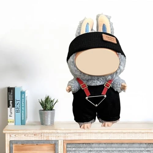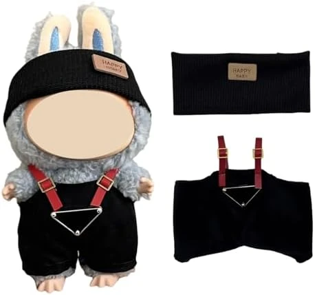 17cm Doll Clothes For Labubu, 2-Piece Clothes For Dolls Outfit, Accessories For Cute Dolls Clothes, Black Hat + Overalls, No Doll Included