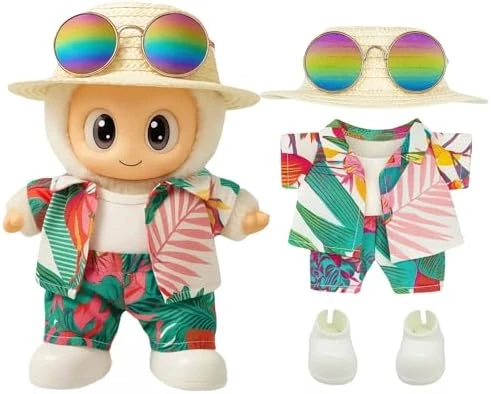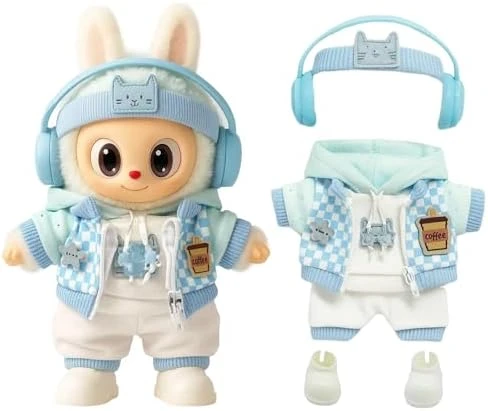 This blue streetwear outfit is designed for 6.69in dolls and includes 5 accessories: headphone-style headband, plaid jacket, hoodie sweatshirt, casual white pants, and shoes. The outfit is fresh and modern, suitable for daily dress-up, display, or collection. Note: Doll is not included. Bunny ears are part of the doll itself, not included in the outfit.